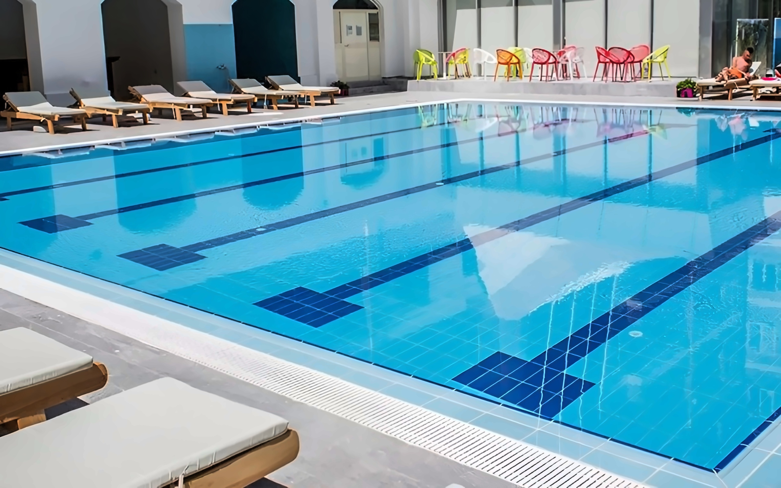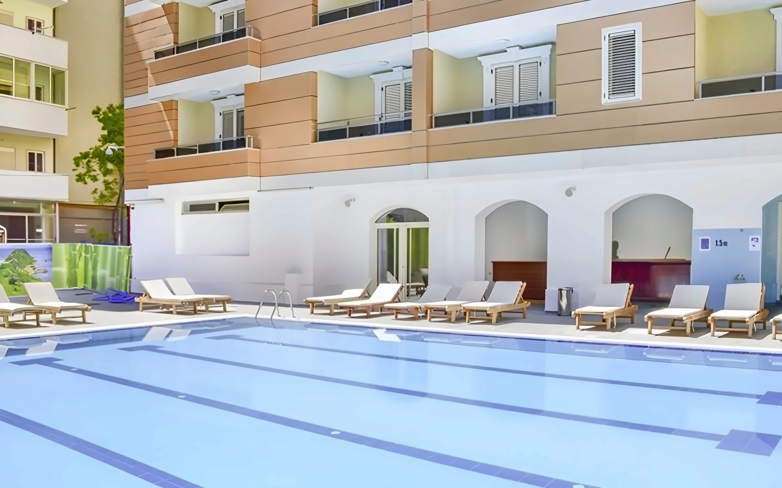 • Pie baseina: sauļošanās krēsli, dvieļi, saulessargi – bez maksas